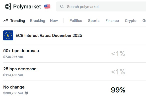 Die Polymarket-Kontrakte zum Thema „ECB Interest Rates: December 2025“ spiegeln die aktuelle Markterwartung an die Notenbankentscheidung sehr deutlich wider (Abbildung 1).