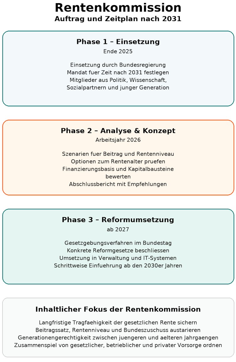 Ziel der Rentenkommission ist letztlich ein Konzept für die Zeit nach 2031, das die gesetzliche Rente finanzierbar und generationengerecht hält. Dazu erarbeitet sie Vorschläge zu Rentenniveau, Beitragssätzen, Renteneintrittsalter, Finanzierungsbasis sowie zum Zusammenspiel von gesetzlicher, betrieblicher und privater Vorsorge.