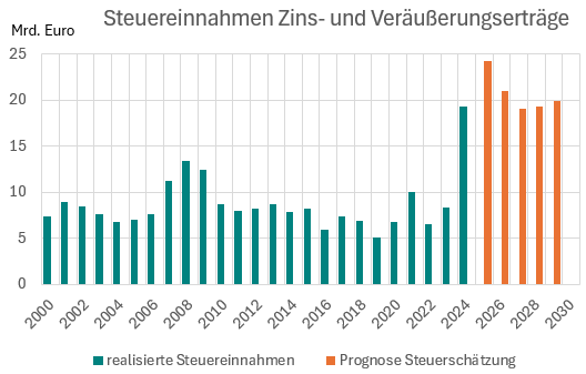 Die offizielle Steuerschätzung vom Oktober 2025 rechnet für 2025 mit einem weiteren Anstieg auf 24,2 Milliarden Euro. 2026 soll das Aufkommen auf 21,05 Milliarden Euro zurückgehen, bleibt damit aber weit über früheren Phasen. Für 2027 und 2028 erwartet die Prognose Werte von 19,05 beziehungsweise 19,3 Milliarden Euro. 2029 könnte mit 19,9 Milliarden Euro eine leichte Verstärkung bringen. Für 2030 unterstellt die Schätzung schließlich 20,45 Milliarden Euro. Insgesamt ergibt sich damit ein dauerhaft hohes Niveau, das etwas unter dem außergewöhnlichen Peak 2025 liegt. Die Zahlen verdeutlichen, wie stark die Steuereinnahmen aus Kapitalvermögen von Zinswende, Marktvolumen und Börsenstimmung abhängen und damit auch künftig erheblichen Schwankungen unterliegen.